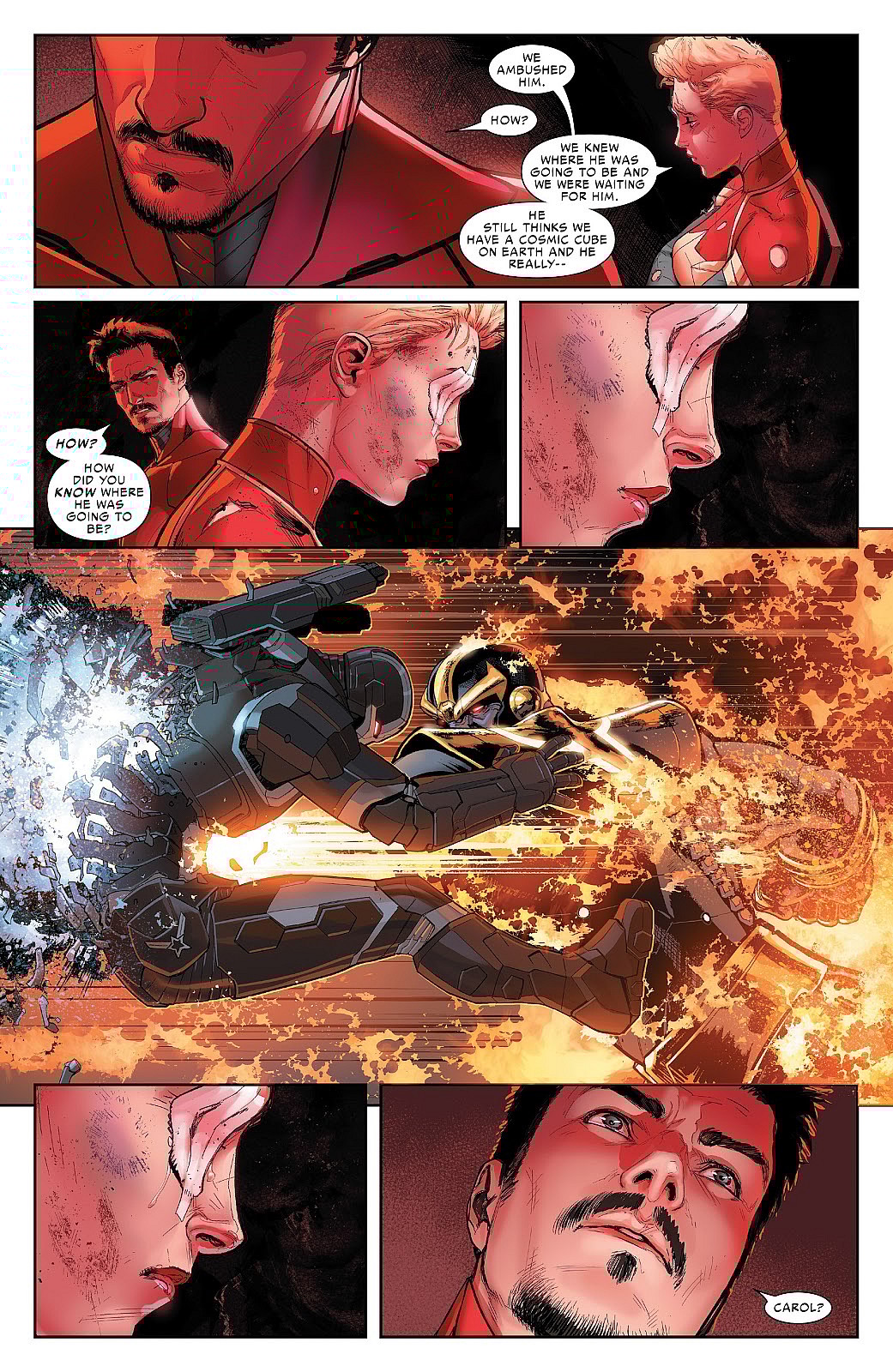 In the [easyazon_link identifier=”1302901575″ locale=”US” tag=”boundingintocomics-20″]Civil War II[/easyazon_link] storyline, Captain Marvel would rely on the visions of an Inhuman named Ulysses in order to protect the Earth from a number of threats. One of those threats was Thanos. She would lead a team of Avengers to confront Thanos, who was searching for a Cosmic Cube. She would be successful in stopping Thanos, but her decision had major consequences. It led to the death of War Machine.