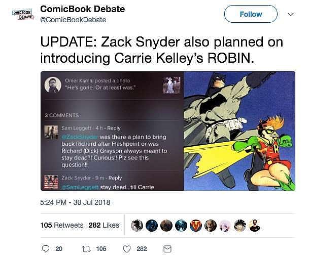Snyder would confirm on Vero that Carrie Kelley was expected to become the next Robin following Dick Grayson’s death.