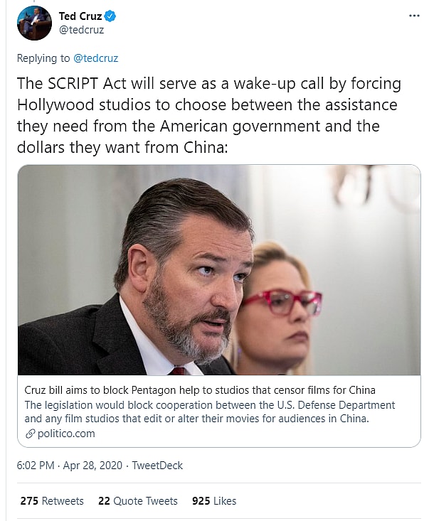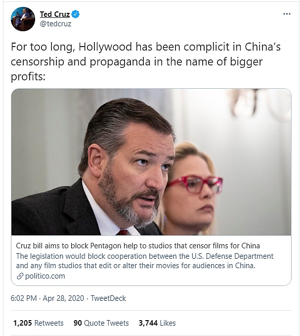 On Twitter, Cruz called the bill a “wake-up call” for Hollywood. He wrote, “For too long, Hollywood has been complicit in China’s censorship and propaganda in the name of bigger profits.”