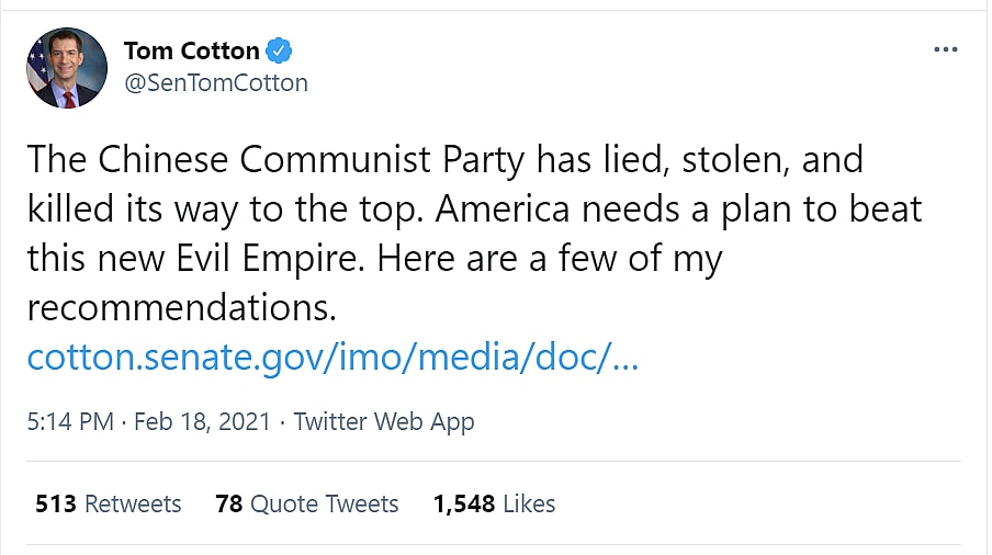 Cotton shared the 84-page plan called Beat China: Targeted Decoupling and the Economic Long War to Twitter, where he stated, “The Chinese Communist Party has lied, stolen, and killed its way to the top. America needs a plan to beat this new Evil empire.”