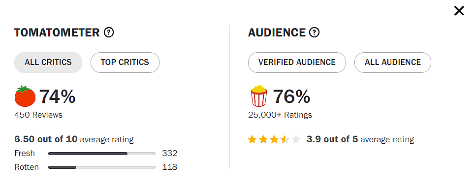 On Rotten Tomatoes, the film has a subpar 76% from over 25,000 ratings. The average score is 3.9 out of 5.