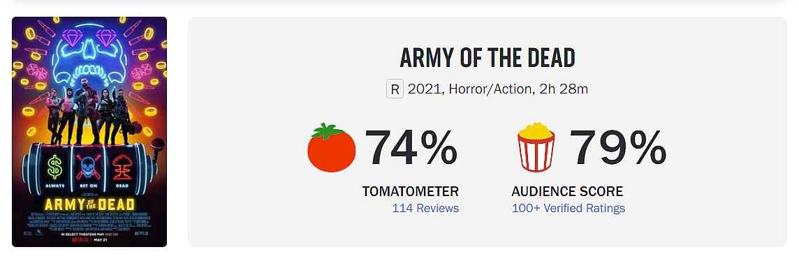 Audience scores have arrived for Zack Snyder’s latest film, Army of the Dead. The movie has had a limited release in theaters, but will be available to stream on Netflix on May 21st.