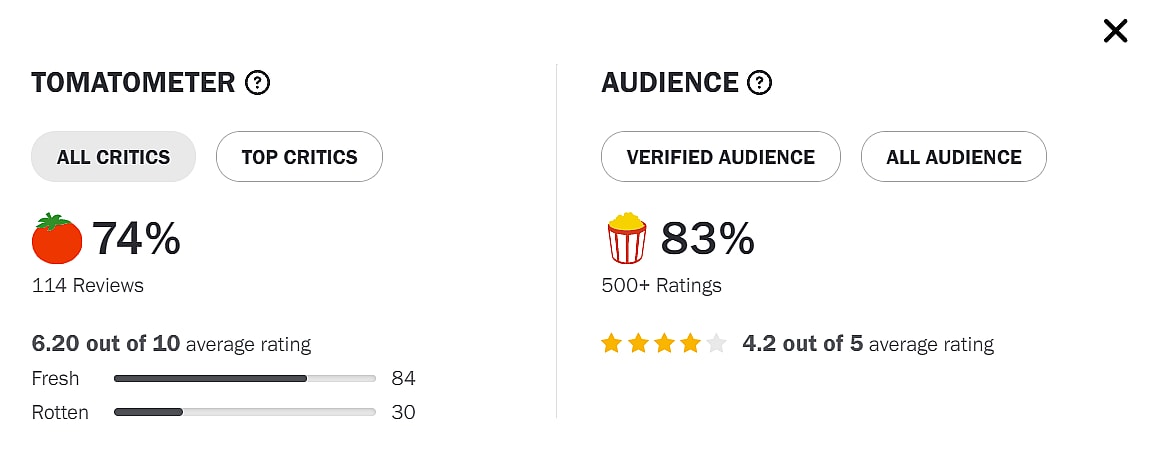 However, that is Rotten Tomatoes Verified Score. If you look at the All Audience score, it has a higher score of 83% with an average rating of 4.2 stars out of 5.