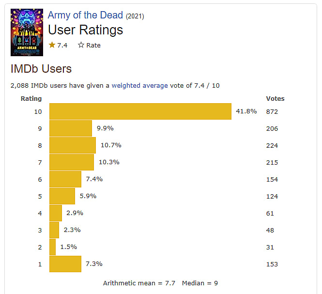 DavidStegen gave the film a 10. He wrote, “It’s amazing what Zack Snyder can do when he has total creative freedom, Army of the Dead is a masterpiece.”