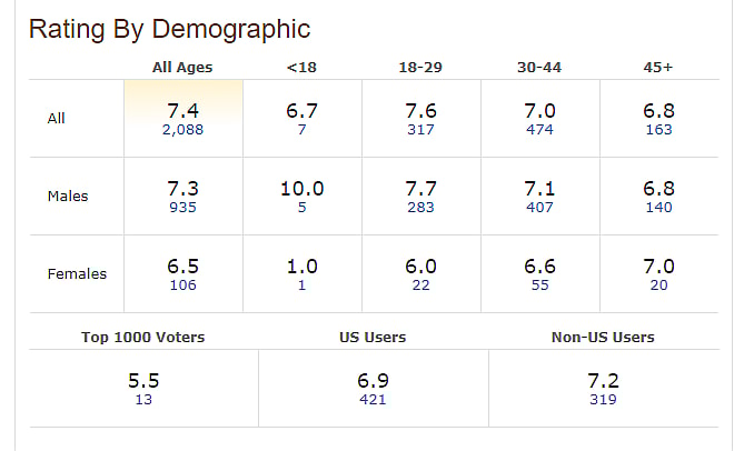 On IMDB the film currently has a weighted average of 7.4 out of 10 from 2,088 IMDB users.