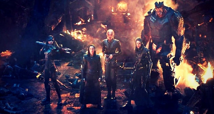 Gamora appears on screen, and imitates the snap that was iconic in Jim Starlin’s Infinity Gauntlet storyline when Thanos wiped out half the universe. We get a shot of Tony Stark asking the name of the Mad Titan, and Gamora informs the audience. We get a new scene with the Mad Titan taking off his helmet. This might be a flashback, because we haven’t seen this version of his armor in any of the other films.