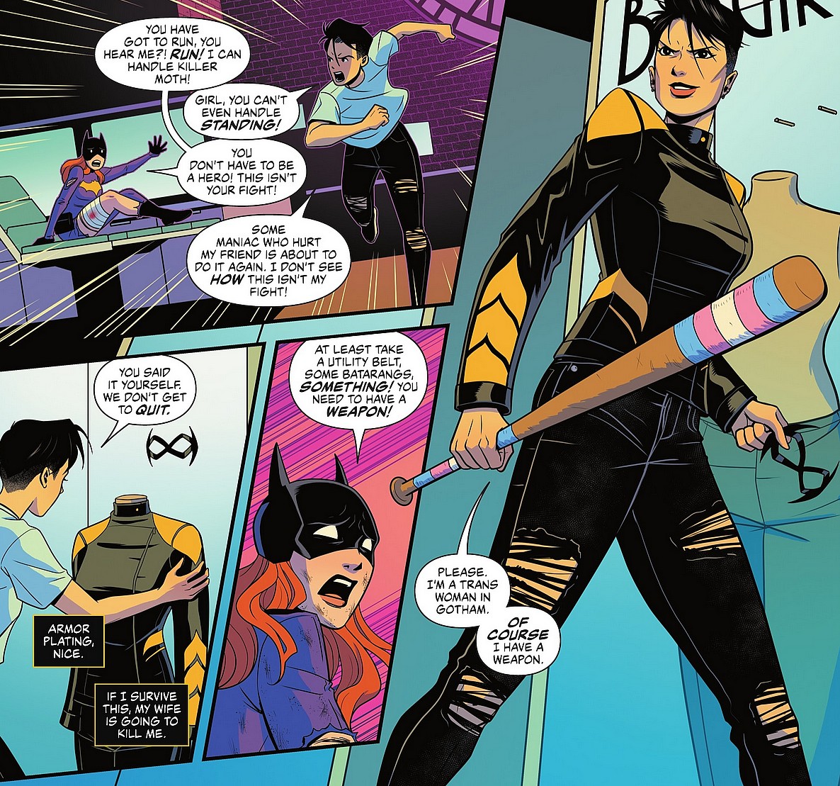 Initially stepping into the Dominoed Daredoll’s life as her roommate, Yeoh has since been set-up to become some iteration of Batgirl, her take on the identity emphasized by her transgender Pride flag-wrapped baseball bat.