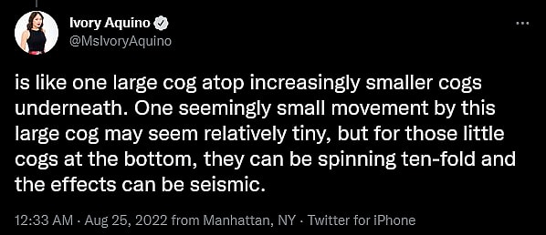 “Tonight I finally got to talk with a dear friend here about these intense feelings who shared with me an anecdote which helped provide inspiration for this letter to you,” said Aquino. “They said the head of a company is like one large cog atop increasingly smaller cogs underneath. One seemingly small movement by this large cog may seem relatively tiny, but for those little cogs at the bottom, they can be spinning ten-fold and the effects can be seismic.”