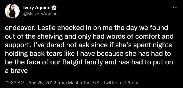 The actor further recalled, “Leslie checked in on me the day we found out of the shelving and only had words of comfort and support. I’ve dared not ask since if she’s spent nights holding back tears like I have because she has had to be the face of our Batgirl family and has had to put on a brave face as a way of taking care of us the way she gracefully steered our film.”