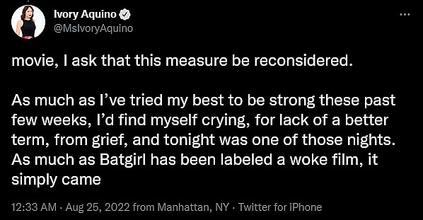 Turning to the many claims that the film – which from the start of production, in an almost surefire sign that its story and writing would come second to promoting its creators’ ideology, marketed itself heavily on the fact that its actress was a race-swap and that it featured a diverse cast – would be “woke”, Aquino then confessed, “As much as Batgirl has been labeled a woke film, it simply came together that way because of writing that reflects the world we live in.”