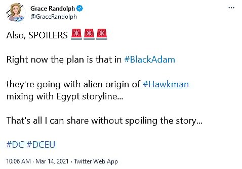 This news comes from YouTuber & Beyond the Trailer host Grace Randolph who tweeted “Right now the plan is that in #BlackAdam…they’re going with alien origin of #Hawkman…mixing with Egypt storyline…”