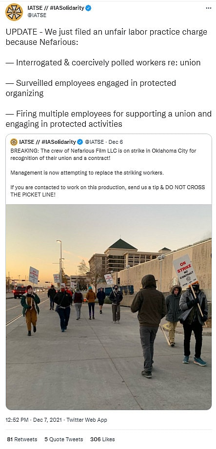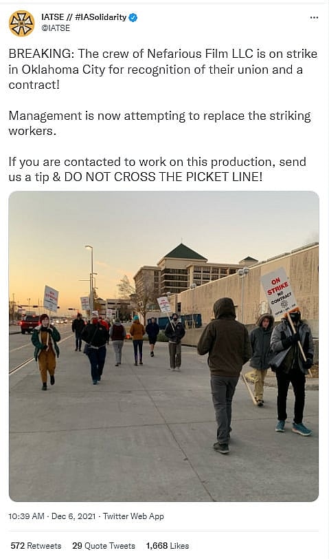 On December 6th, The International Alliance of Theatrical Stage Employees announced on Twitter that “the crew of Nefarious Film LLC is on strike in Oklahoma City for recognition of their union and a contract!”