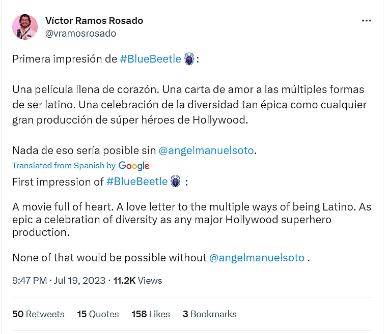 Rosado shared his thoughts to Twitter in Spanish, but using Twitter’s translate function he wrote, “First impression of Blue Beetle: A movie full of heart. A love letter to the multiple ways of being Latino. As epic a celebration of diversity as any major Hollywood superhero production.”