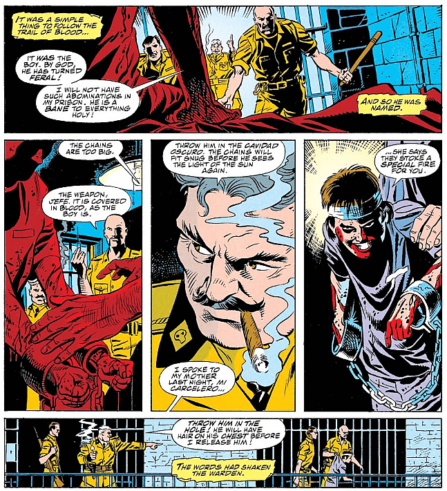 He was born in the prison called Pena Duro and was kept in protective custody until his mother died when he was six. From there he was released into the prison’s general population. After a brutal encounter with two prisoners, he fell and laid in a coma for a month. When he awoke, he brutally murdered one of the prisoners who attempted to make him his pawn. For punishment, the warden sent him to the hole, where he survived on the rats and the fish he killed when the cell was flooded.