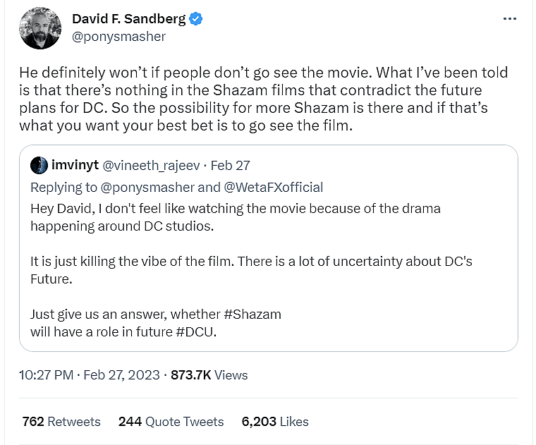 He tweeted, “He definitely won’t if people don’t go see this movie. What I’ve been told is that there’s nothing in the Shazam films that contradict the future plans for DC. So the possibility for more Shazam is there and if that’s what you want your best bet is to go see the film.”