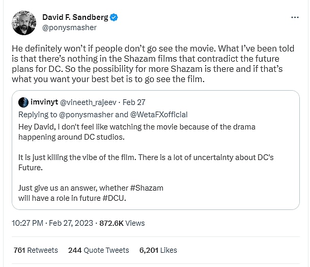 He tweeted, “He definitely won’t if people don’t go see this movie. What I’ve been told is that there’s nothing in the Shazam films that contradict the future plans for DC. So the possibility for more Shazam is there and if that’s what you want your best bet is to go see the film.”