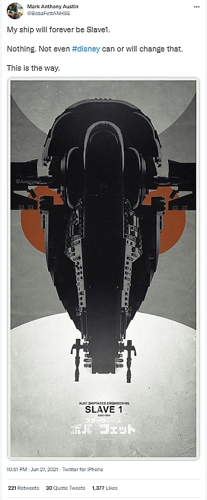Following this revelation, Austin took to Twitter to declare, “My ship will forever be Slave1. Nothing. Not even Disney can or will change that. This is the way.”