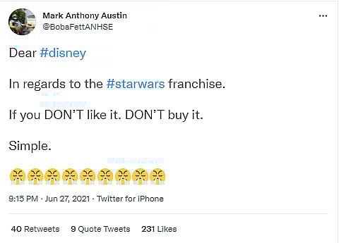 Austin also tweeted, “Dear Disney, In regards to the Star Wars franchise. If you DON’T like it. DON’T buy it. Simple.”