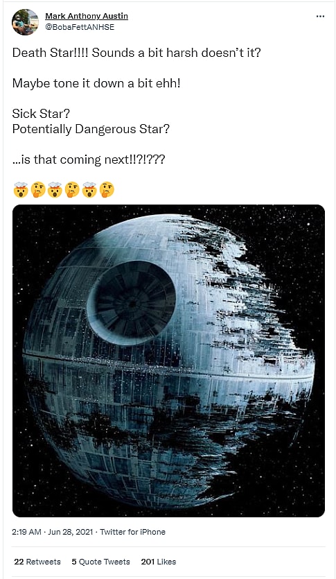 He wrote, “Death Star!!!! Sounds a bit harsh doesn’t it? Maybe tone it down a bit ehh! Sick Star? Potentially Dangerous Star? …is that coming next!!?!???”
