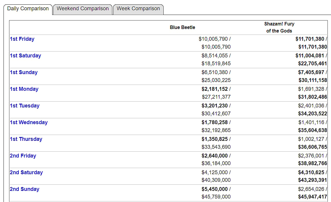Not only did Blue Beetle beat out Shazam! Fury of the Gods in its second weekend, but the film beat Shazam! 2 during the week leading up to the weekend. The only day Shazam! 2 best Blue Beetle was on the second Saturday.