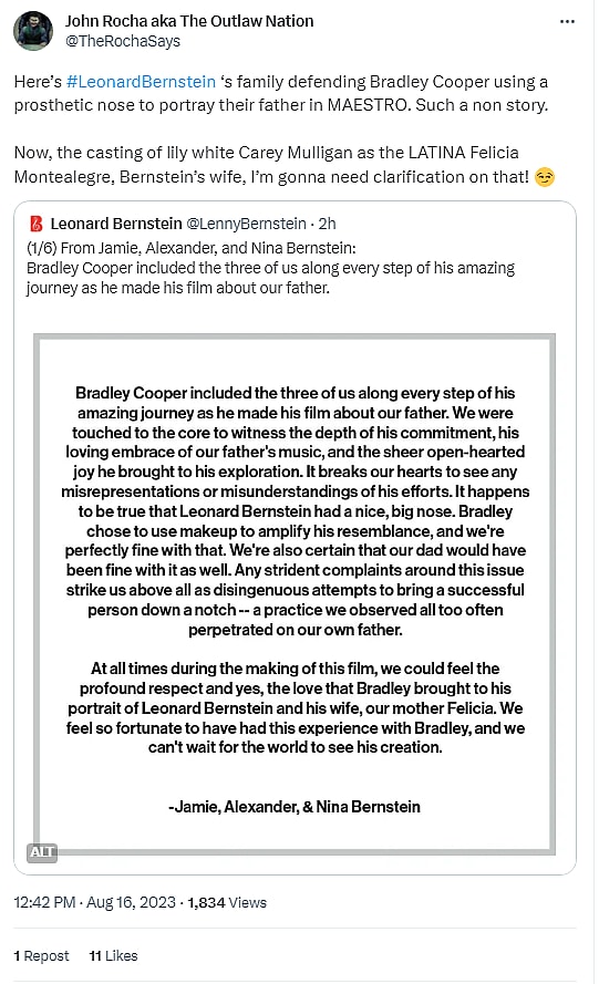 Rocha wrote, “Here’s #LeonardBernstein ‘s family defending Bradley Cooper using a prosthetic nose to portray their father in MAESTRO. Such a non story. Now, the casting of lily white Carey Mulligan as the LATINA Felicia Montealegre, Bernstein’s wife, I’m gonna need clarification on that!”