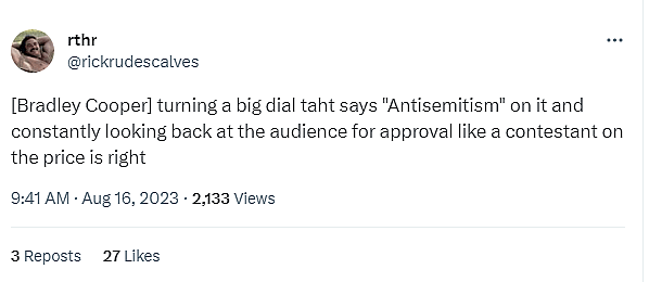 “[Bradley Cooper] turning a big dial taht says ‘Antisemitism’ on it and constantly looking back at the audience for approval like a contestant on the price is right.”