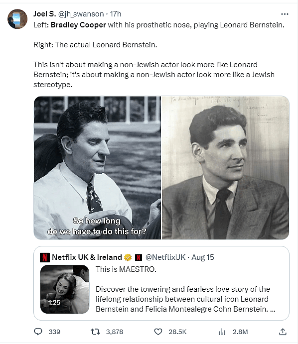 He then opined, “This isn’t about making a non-Jewish actor look more like Leonard Bernstein; it’s about making a non-Jewish actor look more like a Jewish stereotype.”