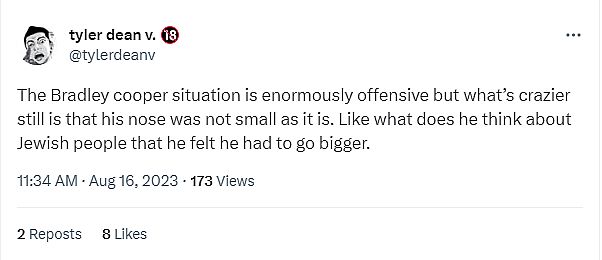 User Tyledeanv wrote, “The Bradley cooper situation is enormously offensive but what’s crazier still is that his nose was not small as it is. Like what does he think about Jewish people that he felt he had to go bigger.”