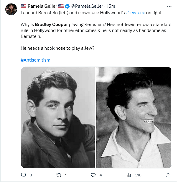 Pamela Geller tweeted, “Leonard Bernstein (left) and clownface Hollywood’s #Jewface on right Why is Bradley Cooper playing Bernstein? He’s not Jewish-now a standard rule in Hollywood for other ethnicities & he is not nearly as handsome as Bernstein. He needs a hook nose to play a Jew? #Antisemitism.”