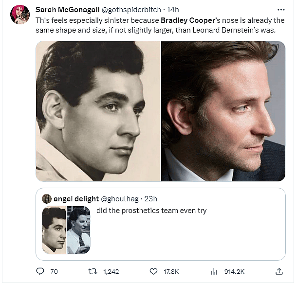 Sarah McGonagall tweeted, “This feels especially sinister because Bradley Cooper’s nose is already the same shape and size, if not slightly larger, than Leonard Bernstein’s was.”