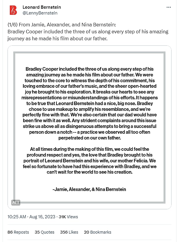 In response to these reactions and others like them, Bernstein’s three children Jamie, Alexander and Nina issued a statement supporting Cooper’s use of the prosthetic nose.