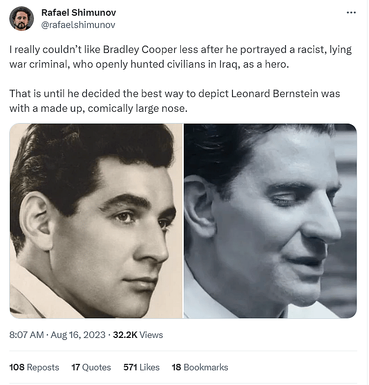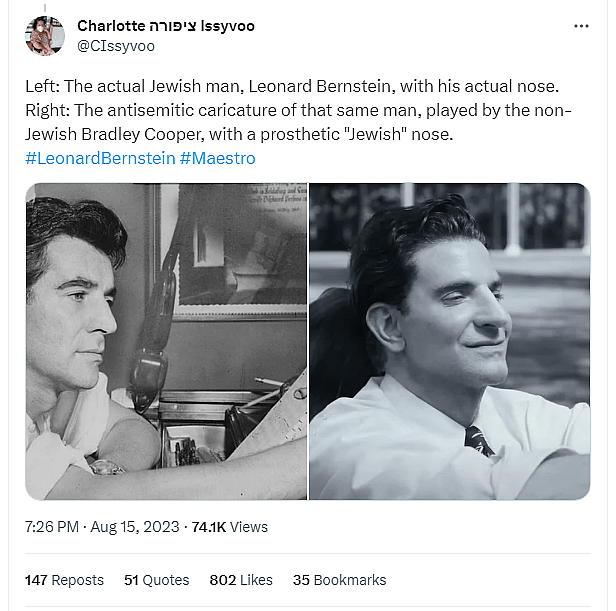 Twitter user CIssyvoo tweeted, “Left: The actual Jewish man, Leonard Bernstein, with his actual nose. Right: The antisemitic caricature of that same man, played by the non-Jewish Bradley Cooper, with a prosthetic ‘Jewish’ nose.”