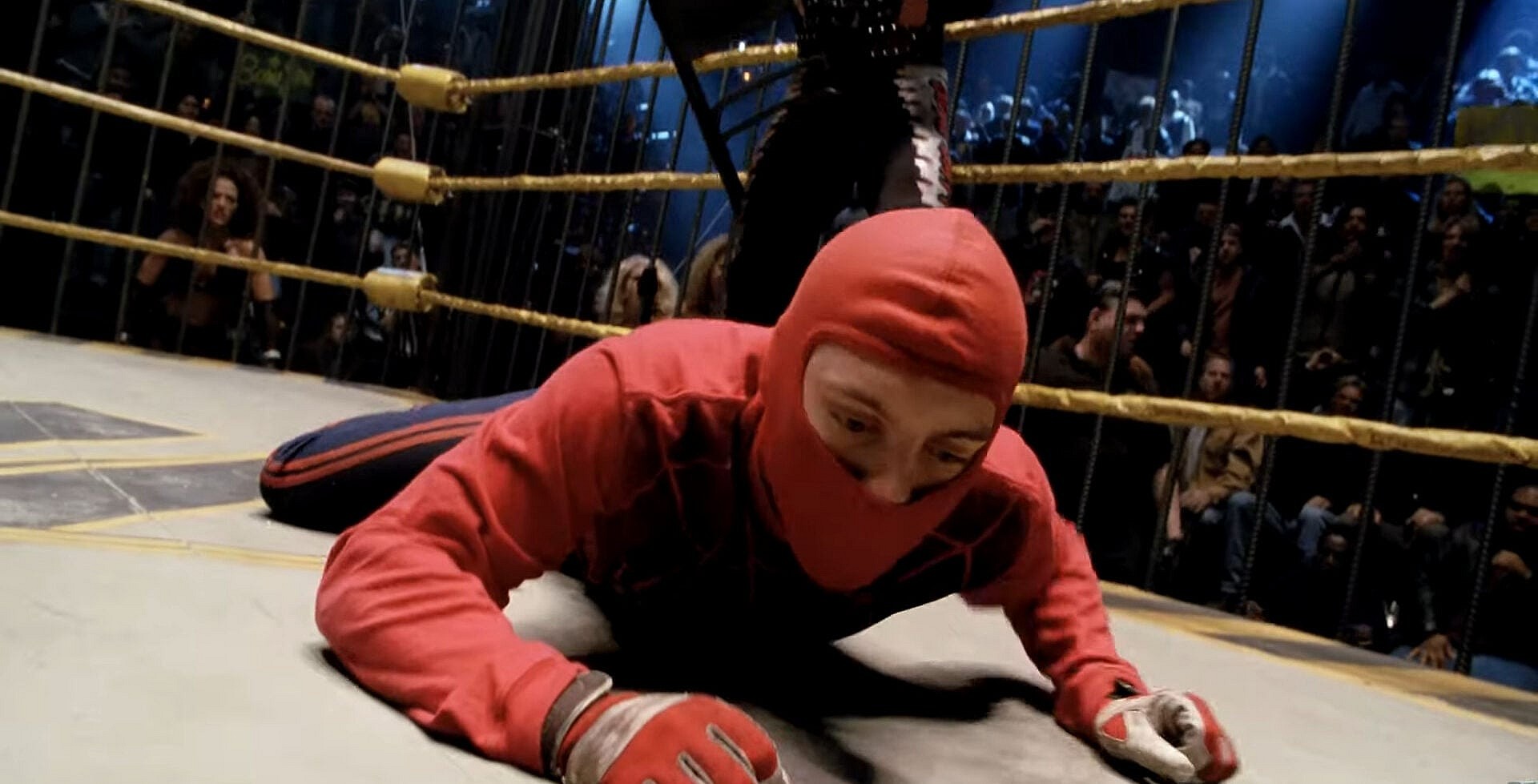 As the bell rings to begin the fight, Peter leaps out of Bonesaw’s reach, using his newfound spider-abilities to stick to the arena’s cage.