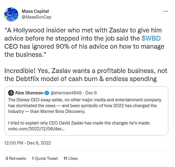 And if you think Zaslav is acting blindly or wouldn’t be advised to act as he has so far, there are investors and firms who – seeing that the current Hollywood business model isn’t working – believe in what he is doing. “Incredible! Yes, Zaslav wants a profitable business, not the Debtflix model of cash burn & endless spending,” Masa Capital’s Twitter says to CNBC.