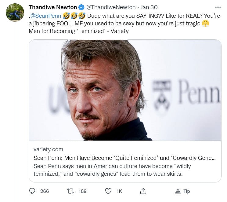Newton responded to these comments on Twitter, exclaiming, “Sean Penn, Dude what are you SAY-ING?? Like for REAL? You’re a jibbering FOOL. MF you used to be sexy but now you’re just tragic.”