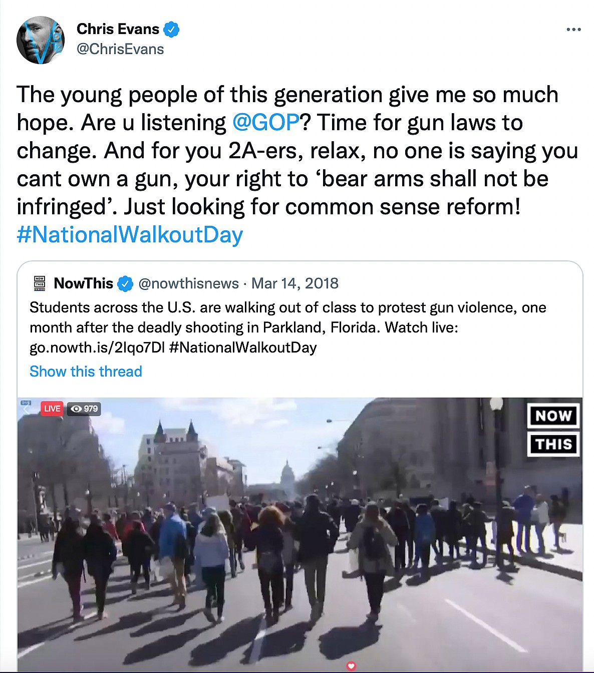 “The young people of this generation give me so much hope,” said Evans, “Are u listening @GOP? Time for gun laws to change. And for you 2A-ers, relax, no one is saying you cant own a gun, your right to ‘bear arms shall not be infringed’. Just looking for common sense reform! #NationalWalkoutDay.”