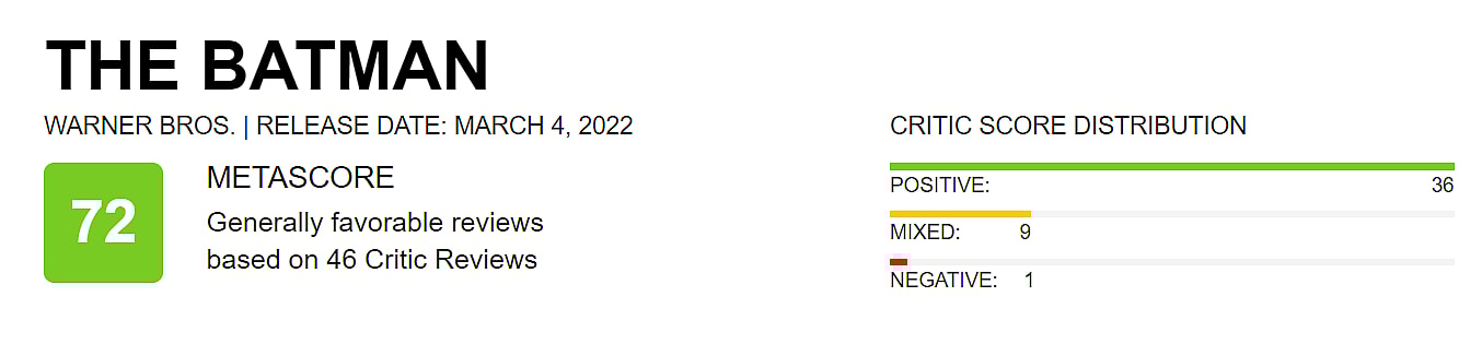 Todd Gilchrist at TheWrap gives the film an 88 as well. He says, “With Pattinson glowering beneath his cowl, Reeves creates a Batman whose psychology is at least as interesting as his crime-fighting activities, for the first time in a long time.”