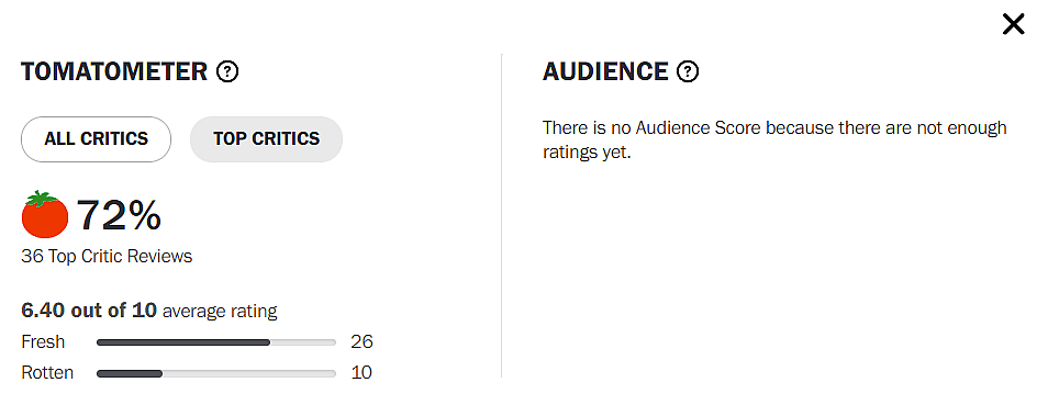 Looking at the Top Critics score, it sits at 72% from 36 reviewers with an average rating of 6.4 out of 10. There are 26 fresh reviews and 10 rotten reviews.