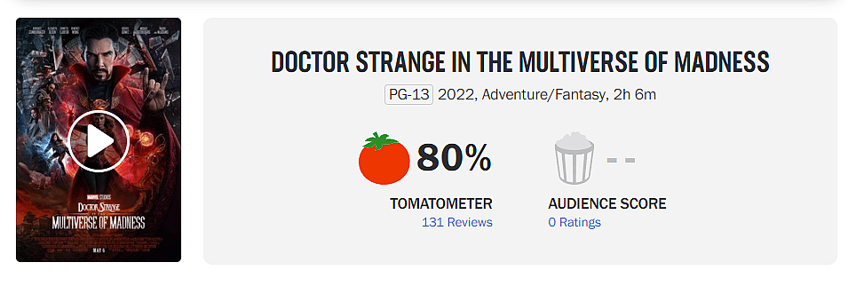 Mike Ryan at Uproxx gives the movie a 75. He says, “Honestly, it’s kind of remarkable what Marvel let Raimi get away with, but all that doesn’t really kick in until maybe an hour into the movie, and it becomes a much better movie once that happens.”