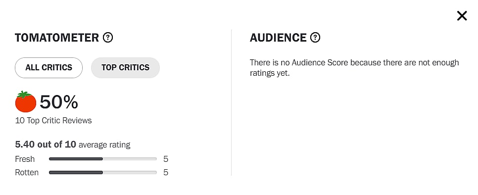 Rotten Tomatoes’ Top Critics score sits at 50% with an average rating of 5.4 out of 10. There are five rotten reviews and five fresh reviews.