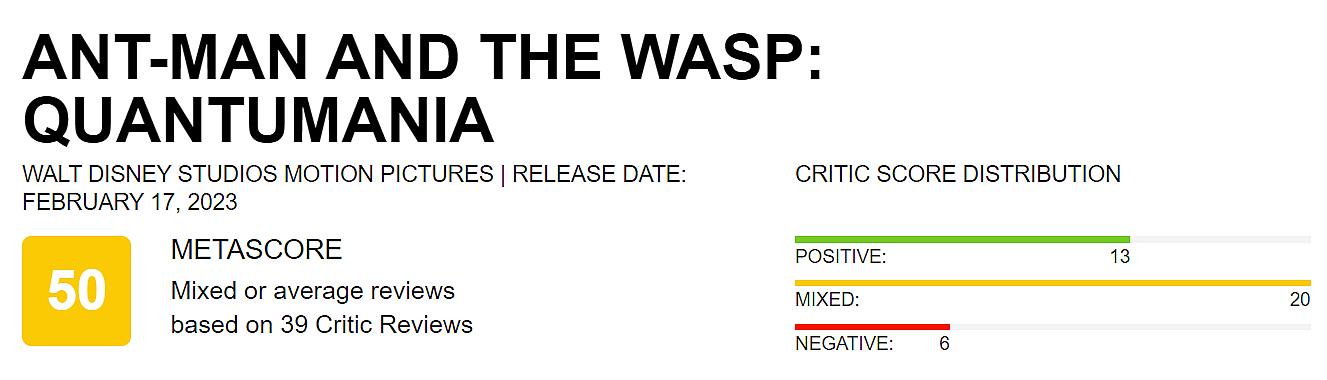 Soren Andersen from The Seattle Times gave the film a 38. Andersen wrote, “‘I’m tired.’ — Overheard from a member of the audience at the end of the seemingly endless closing credit crawl at the critic’s screening for Ant-Man and The Wasp: Quantumania. – I hear you, lady. Believe me, I hear you.”