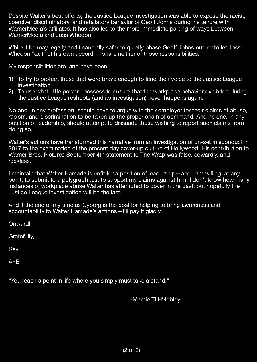 On the second page of the letter, Fisher wrote, “Despite Walter’s best efforts, the Justice League investigation was able to expose the racist, coercive, discriminatory, and retaliatory behavior of Geoff Johns during his tenure with WarnerMedia’s affiliates. It has led to the more immediate parting of ways between WarnerMedia and Joss Whedon.”