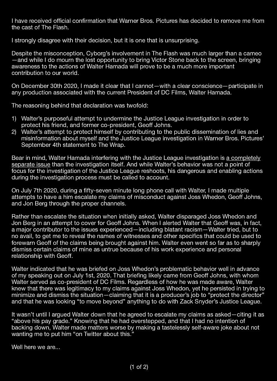 “Despite the misconception, Cyborg’s involvement in The Flash was much larger than a cameo – and while I do mourn the lost opportunity to bring Victor Stone back to the screen, bringing awareness to the actions of Walter Hamada will prove to be a much more important contribution to our world” he continues.