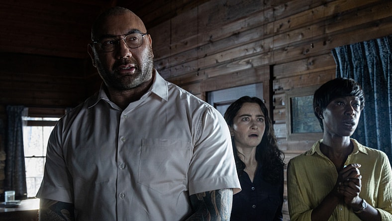 From left: Dave Bautista, Abby Quinn, and Nikki Amuka-Bird in KNOCK AT THE CABIN, directed and co-written by M. Night Shyamalan