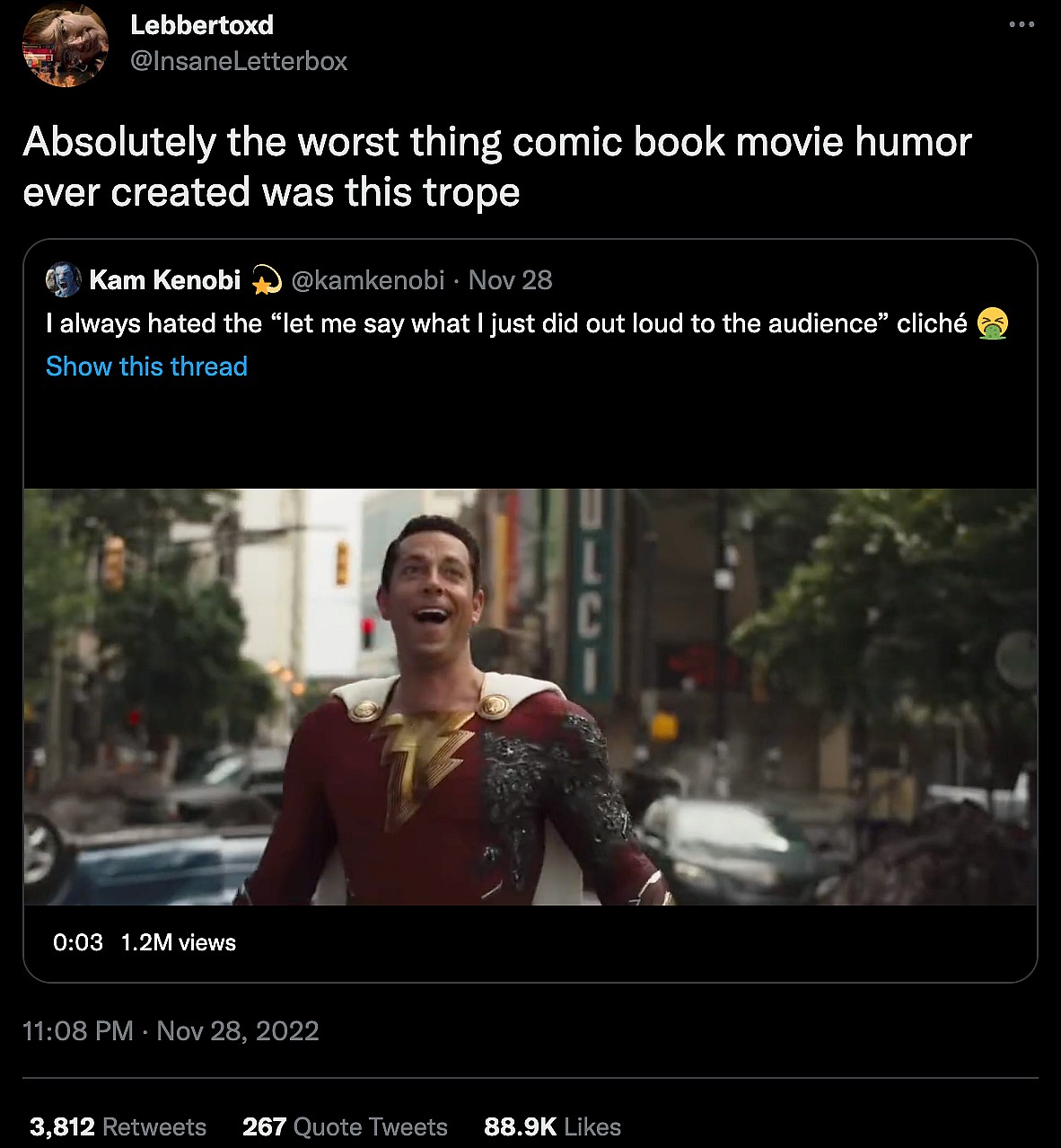 “It’s unfortunate because @ponysmasher[David Sandberg] seems like a great guy and has made some really interesting content on YouTube going over his directing decisions. The first Shazam movie gave me massive ‘ehh’ vibes and I’m not holding my breath for the second one,” says Rachel’s tweet. Sandberg replied to explain himself and assure the line won’t drag down the movie since it’s not in there.