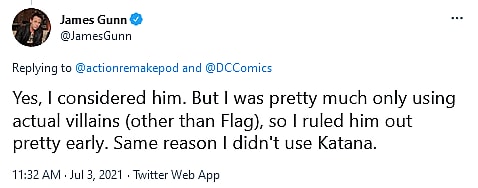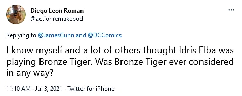 When asked by another fan if he ever considered using Bronze Tiger in the film, Gunn confirmed that he had “considered him”, but since he “was pretty much only using actual villains (other than [Rick] Flag),” the director noted that he “ruled [Bronze Tiger] out pretty early.”