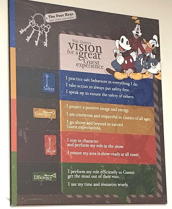“The Four Keys” refer to a Disney training philosophy in which employees are trained to prioritize the ‘key’ elements of “Safety, Courtesy, Show, and Efficiency”, in that order, to ensure that theme park guests enjoy their experiences.