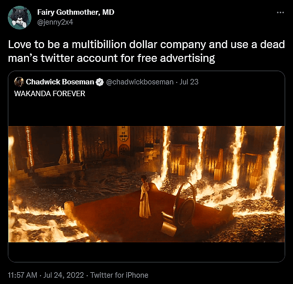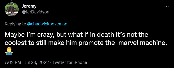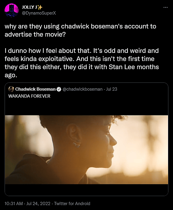 “why are they using chadwick boseman’s account to advertise the movie?” asked @DynamoSuperX. “I dunno how I feel about that. It’s odd and weird and feels kinda exploitative. And this isn’t the first time they did this either, they did it with Stan Lee months ago.”