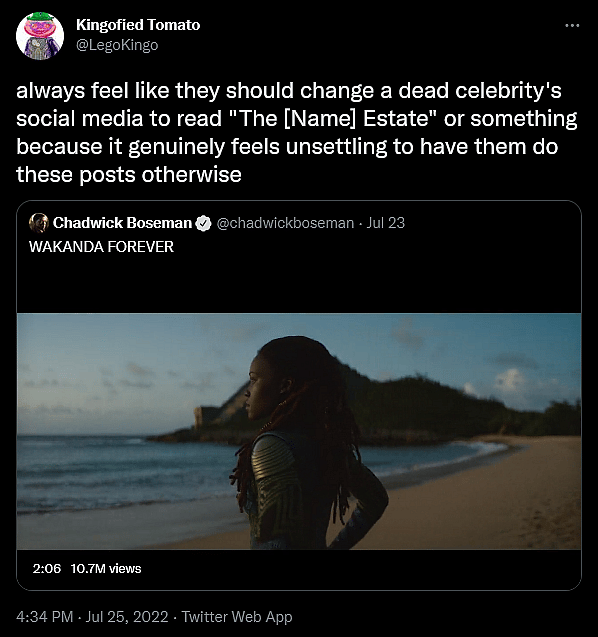 @LegoKingo opined, “always feel like they should change a dead celebrity’s social media to read “The [Name] Estate” or something because it genuinely feels unsettling to have them do these posts otherwise”.