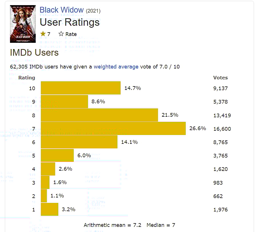 On IMDB, it only has a weighted average of 7.0 out of 10. The arithmetic mean is 7.2, while the median score is 7.